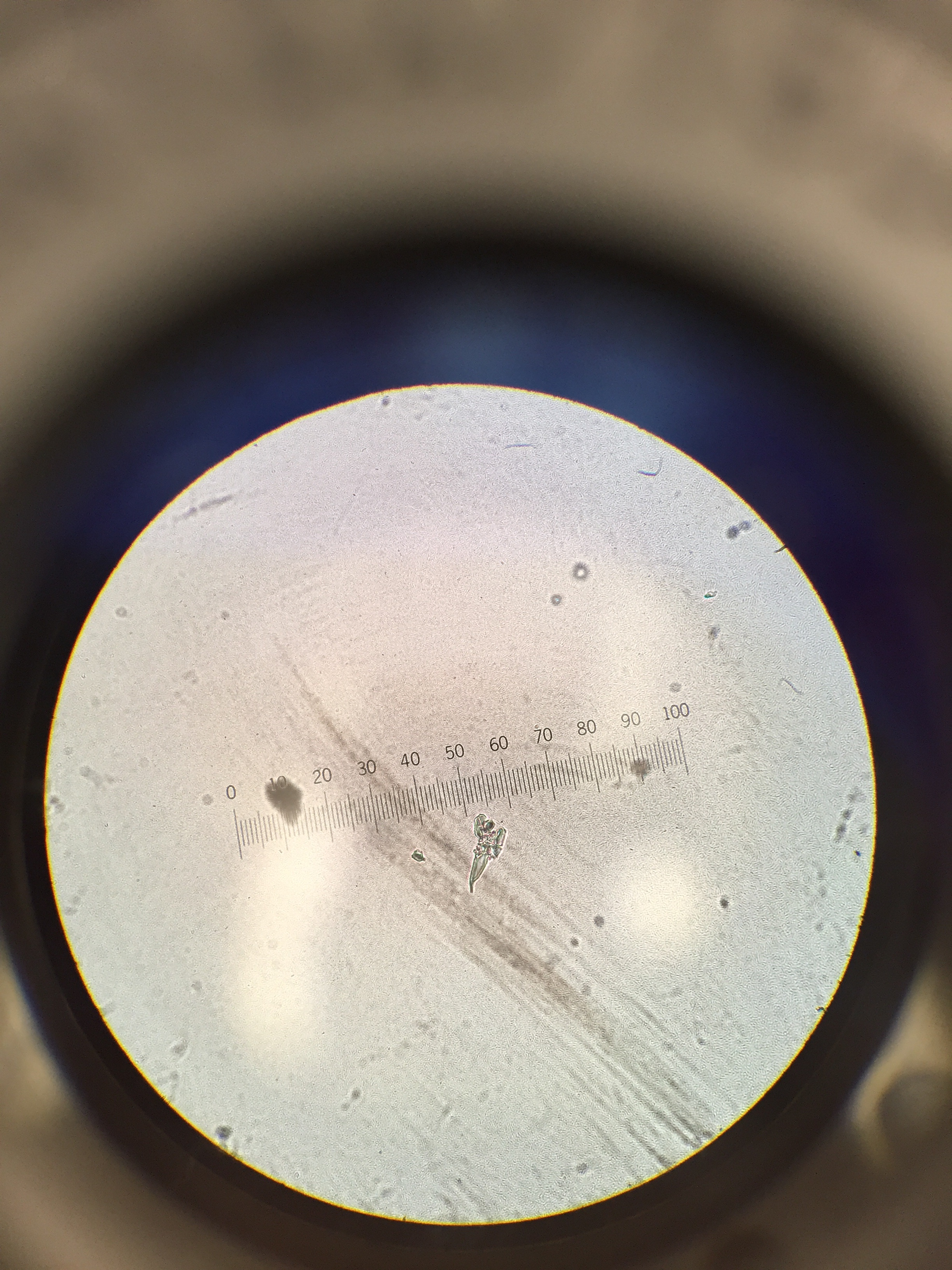 Paramecium: 210μm in length; colorless; flat; quite large compared to other organisms found; oval like in shape; non-motile, protist; not photosynthesizing