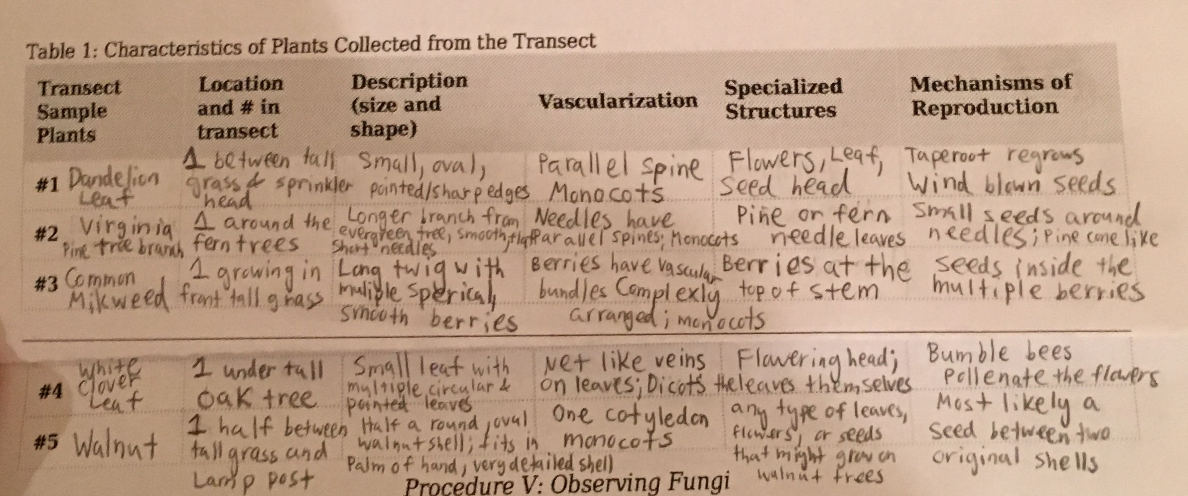 Materials and Methods -Collected 5 or more plant or fungal samples from different parts of our transect -Observed the 5 plant samples that we found under the dissecting scope -Used razor blades or scissors to cut open and analyze the inside of the plant materials and observed under dissecting scope again -Identified certain characteristics such as vascularization, specialized structures, mechanisms of reproduction, shape, and size, and recorded that information in the plant characterization table -Determined if the plants were monocots or dicots using the key provided in the lab -Used a field guide from the library to try to identify what the plant samples were (Source cited down below)