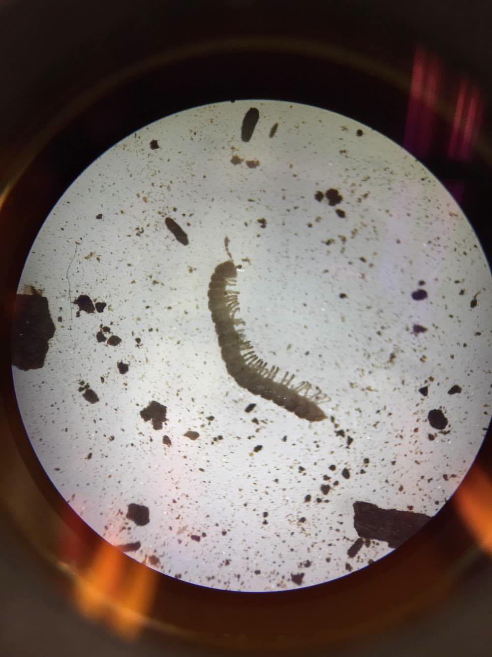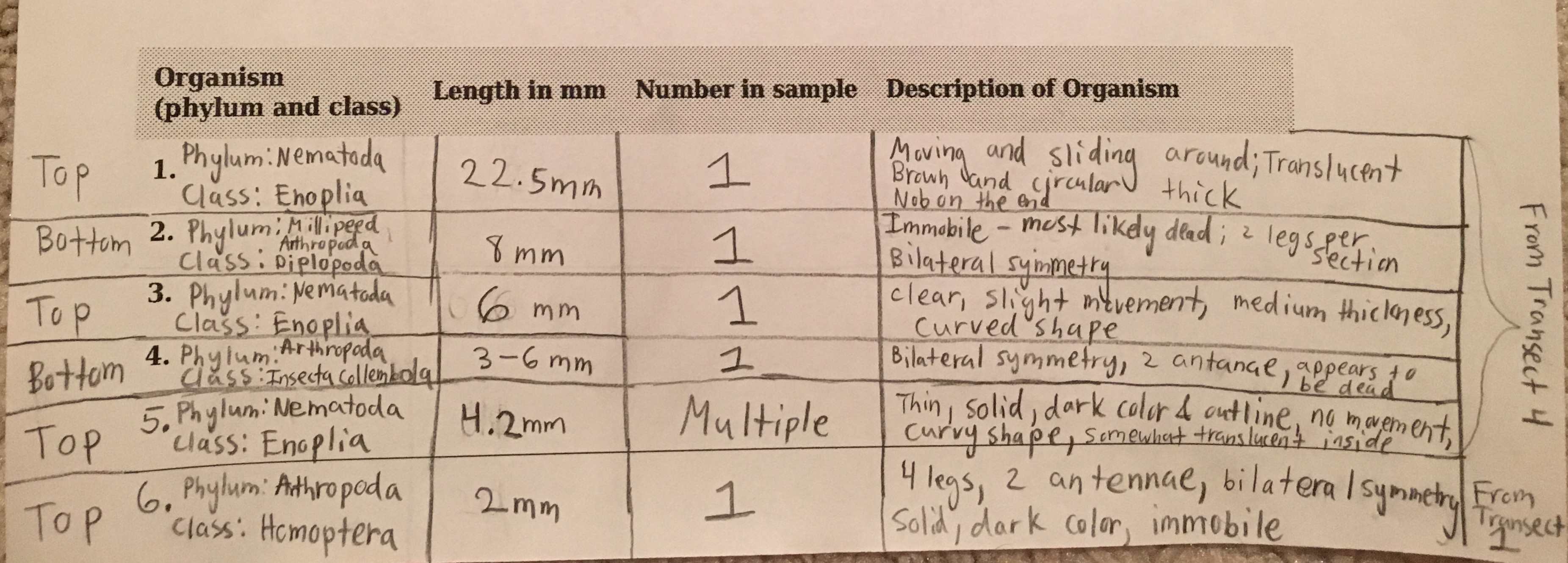 The six invertebrates found in the Berlese Funnel collections include: 3 Phylum: Nematoda; Class: Enoplia, 1 Phylum: Arthropoda; Class: Diplopoda, 1 Phylum: Arthropoda; Class: Insecta Collembola, and 1 Phylum: Arthropoda; Class: Homoptera, as shown below in Table 1. Note that the first five invertebrates listed in the table came from Transect 4, and the last one came from our Transect 1. The size range of the organisms were from 2mm to 22.5mm. One of the Nematoda Enoplia is the largest organism at 22.5mm, and the Arthropoda Homoptera measured the smallest at 2mm. The most common organisms in the leaf litter were Nematoda Enoplia, and also three different types of Arthropods. The top and bottom samples from Transect 4 are different in that the top sample contained Nematoda Enoplia, and the bottom sample contained arthropods. The top sample from Transect 1 contained an arthropod as well.