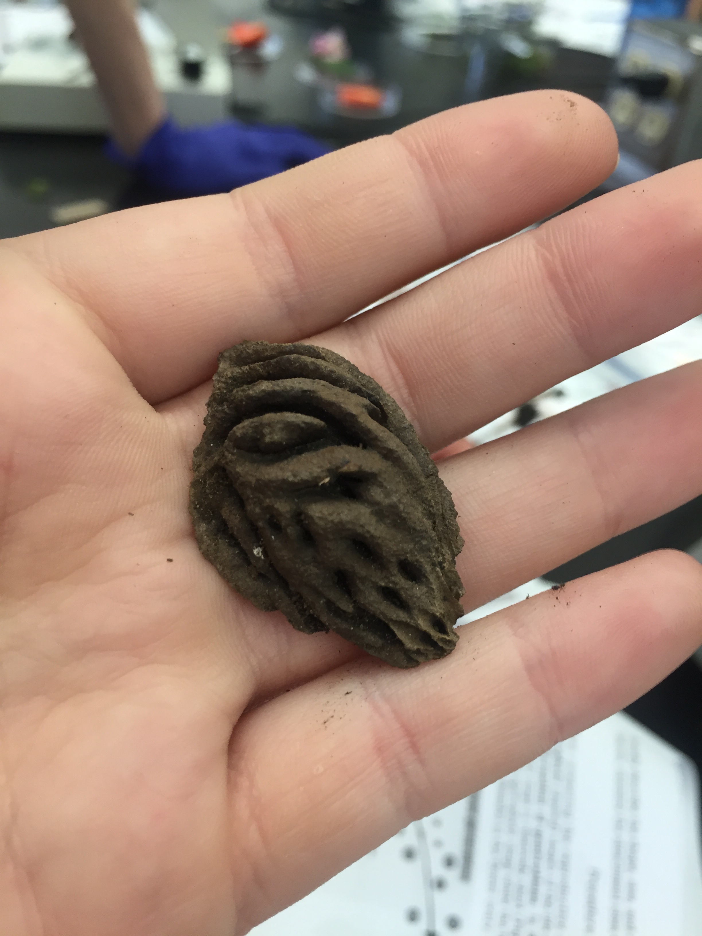 Walnut: These are two pictures of the walnut shell that was found near the lamp post on the western end of the transect. The first picture is of the elaborate front of the shell, and the second is of the inside where a seed most likely used to exist.