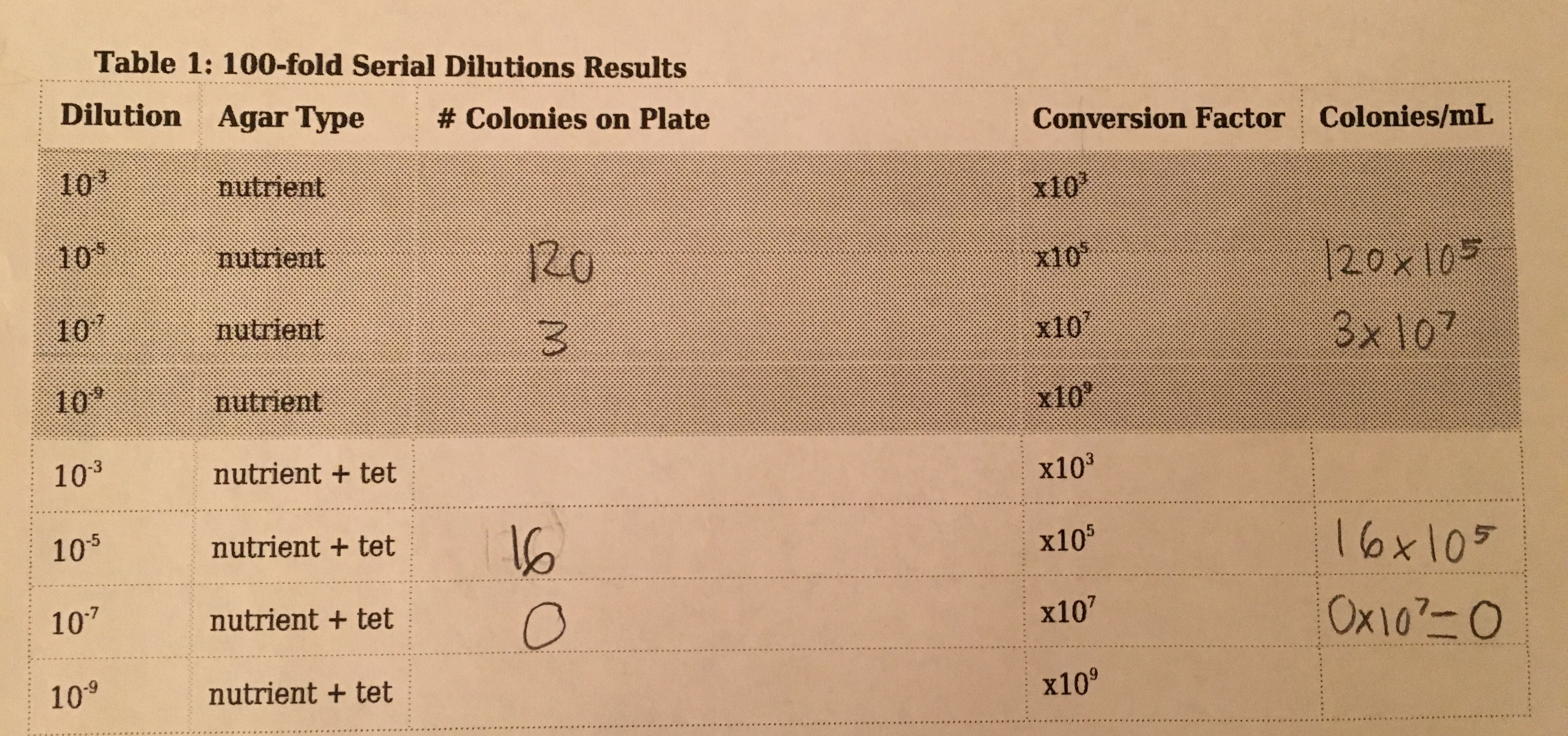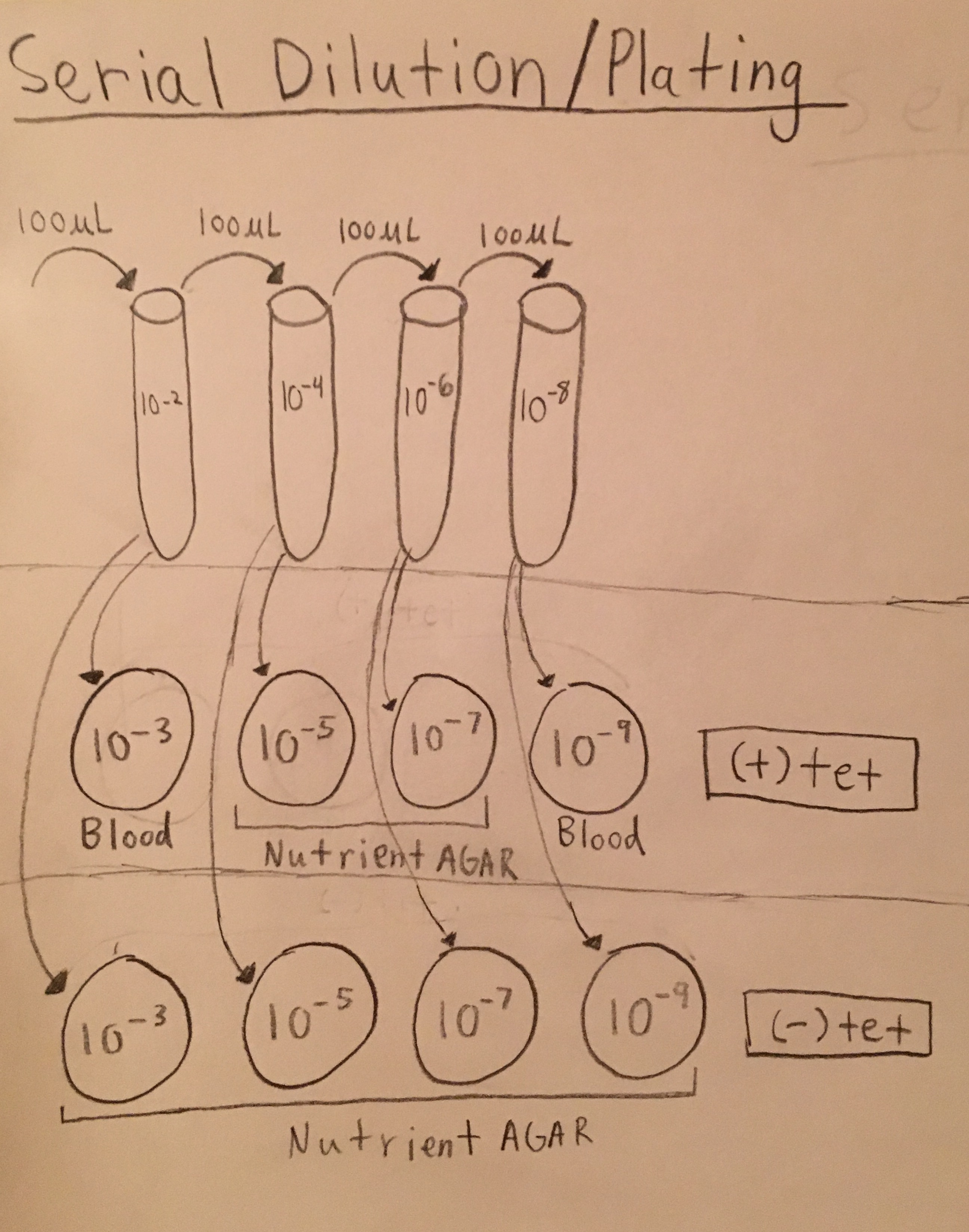 Serial Dilution/Plating Description: Four tubes were filled with 10mL of broth. The four tubes were labeled: 10-2, 10-4, 10-6, 10-8. 100μL of solution from the Hay Infusion Culture were pipetted into the 10-2 tube, then 100μl from 10-2 solution pipetted into the 10-4 tube, 100μL from 10-4 solution pipetted into the 10-6 tube, and finally 100μL from 10-6 pipetted into the 10-8 tube, as shown in Figure 1 below. Next the 100μL from each tube were placed on two sets of four petri dishes. The first set of plates contained tetracycline, and two plates were filled with blood while the other two were filled with nutrient agar. The other set of plates each contained nutrient agar but did not contain tetracycline. The plates were labeled: 10-3, 10-5, 10-7, 10-9. In both sets of plates, 100μL from the 10-2 tube was pipetted onto the 10-3 plate, 100μL from 10-4 tube was pipetted onto the 10-5 plate, 100μL from 10-6 tube was pipetted onto 10-7 plate, and 100μL from 10-8 tube was pipetted onto 10-9 plate, as shown in Figure 1 below. The petri dishes were set aside for one week to observe the bacterial growth.