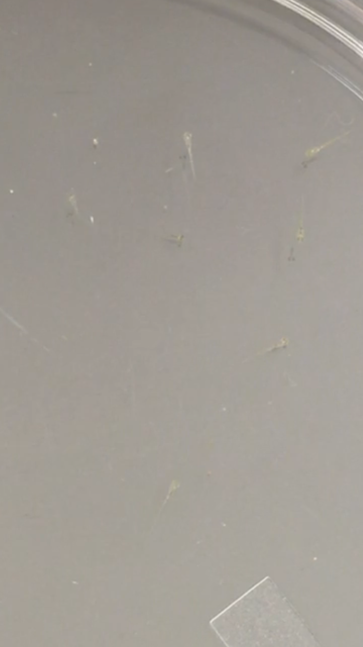 Materials and Methods In order to replace the zebrafish from the tap water control group that did not hatch by Friday, Feb. 26, approximately twenty new zebrafish that were nine days post fertilization were placed in a petri dish. The petri dish was filled up to a line on the bottom of the plate with half deer park water and half tap water from the same container that was used in the first batch that did not survive. The zebrafish were then given 30μL of brine shrimp as food to last them till Monday, Feb. 29.