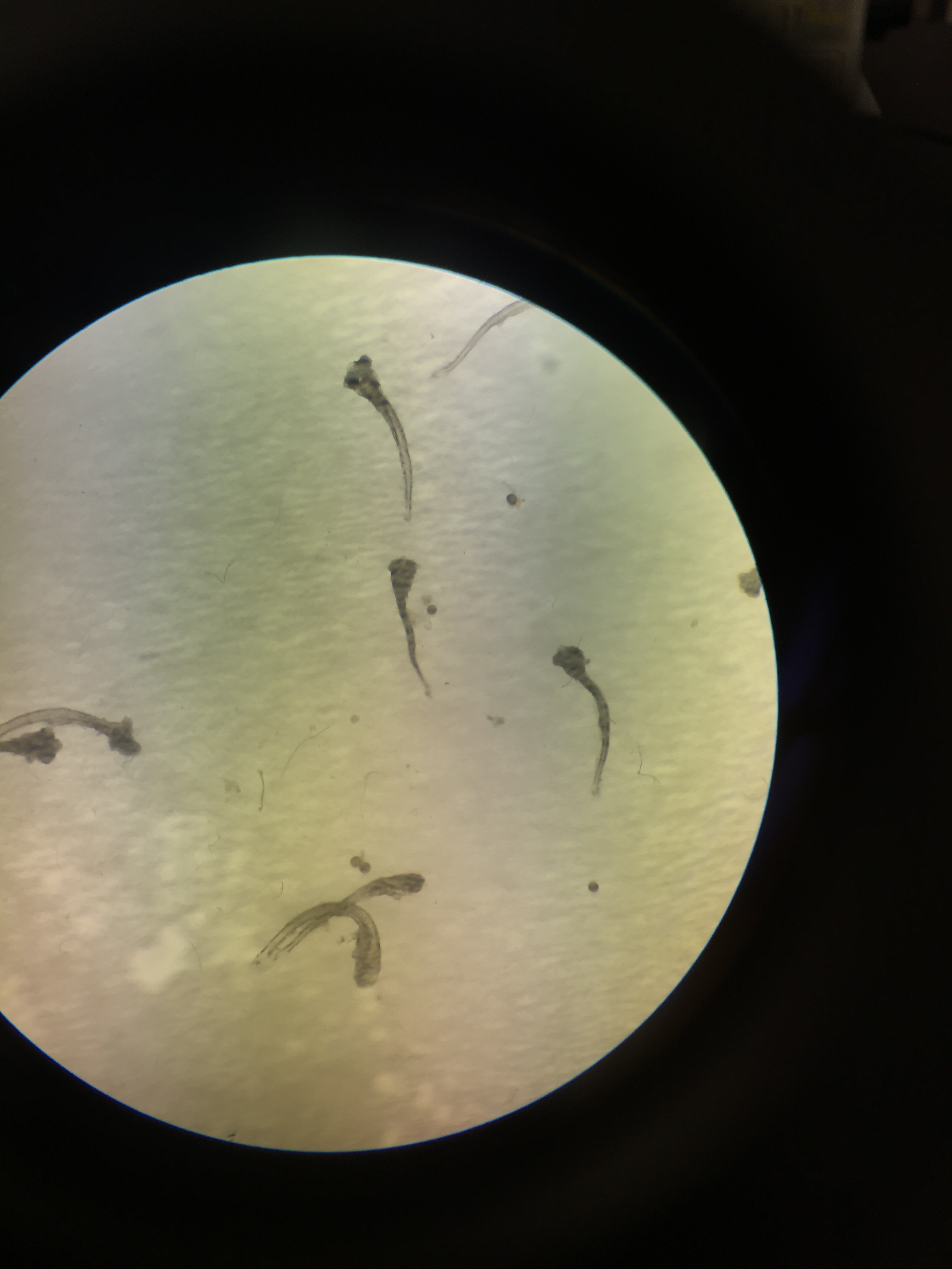 Group of deceased zebrafish under dissecting scope - 1x magnification; 11 days post fertilization