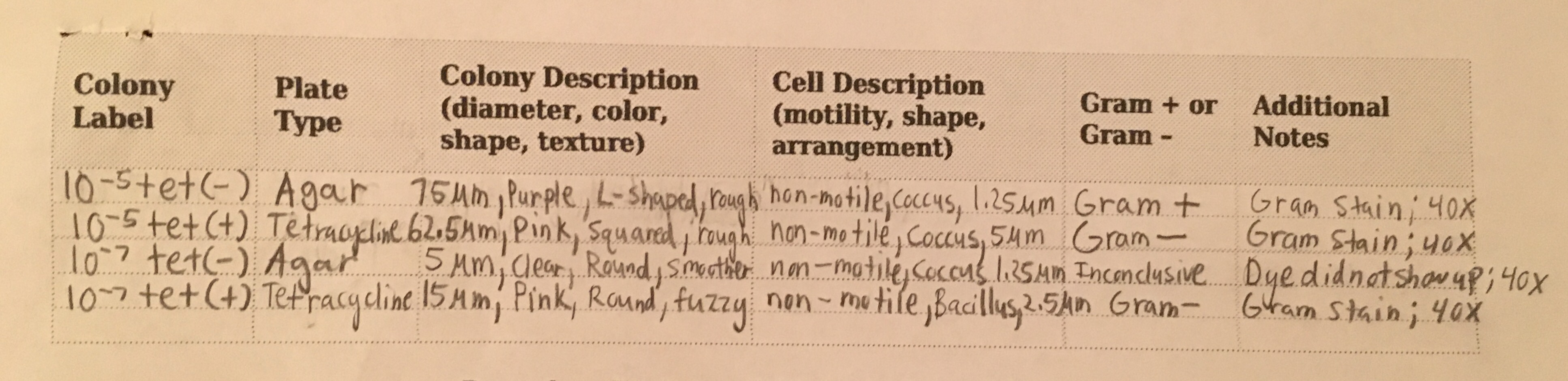 For the DNA isolation and PCR amplification process, bacterial colony growth was scooped out of two agar plates with sterile toothpicks. One agar plate had tetracycline, and the other did not. 20μL of primer mixture was added to two PCR tubes and were mixed thoroughly to dissolve the beads. The two bacterial colonies were then placed in the PCR mixtures of separate tubes, and were placed in the PCR machine. The process was performed to amplify the 16S rRNA gene and allow the bacterial colonies to be further characterized.