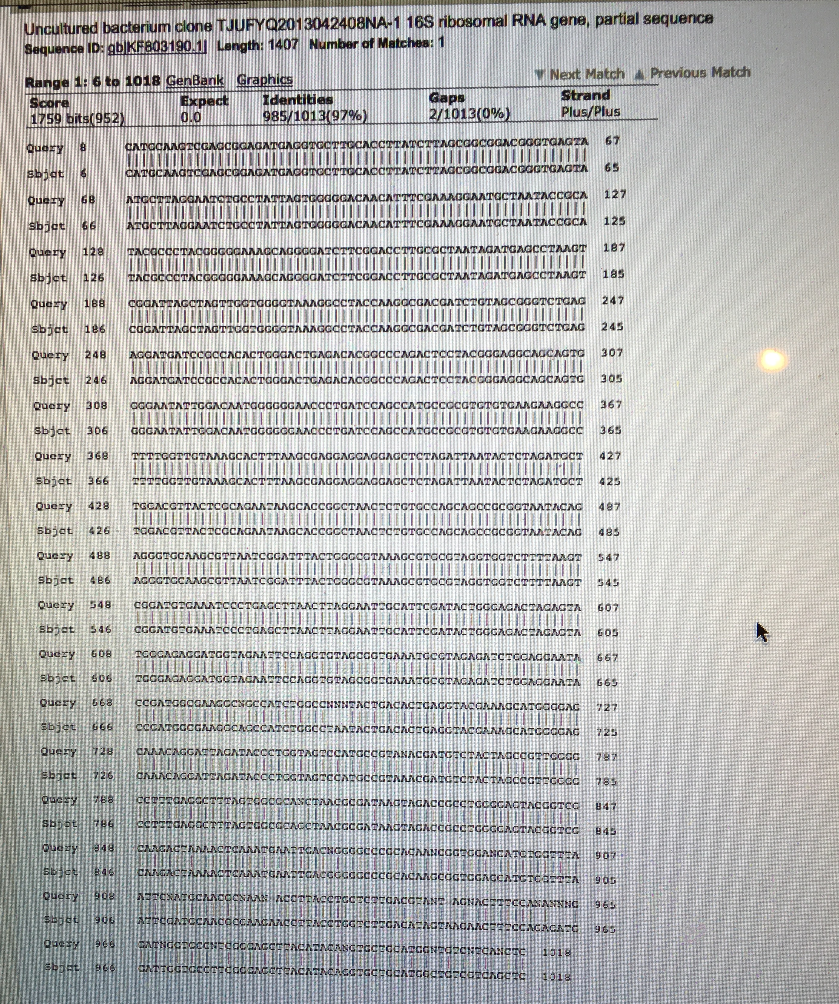 The nucleotide bacterial sequence from Transect One is shown below in Figure 1. After running the nucleotide blast, the results showed that the bacteria in the transect are uncultured bacterium clone. While it is possible that uncultured bacteria are in Transect One, the bacteria that was observed with the gram stain does not match up. It appears that uncultured bacterium is refering to bacteria that cannot be grown in a lab. However, the bacterial samples from Transect One grew on the agar and blood Petri dishes after one week. There was one agar plate however that did not get any growth at all, which could indicate that either the antibiotics restricted the growth or that the bacteria was uncultured. The results of the mei peptide blast are shown below in Figure 2.