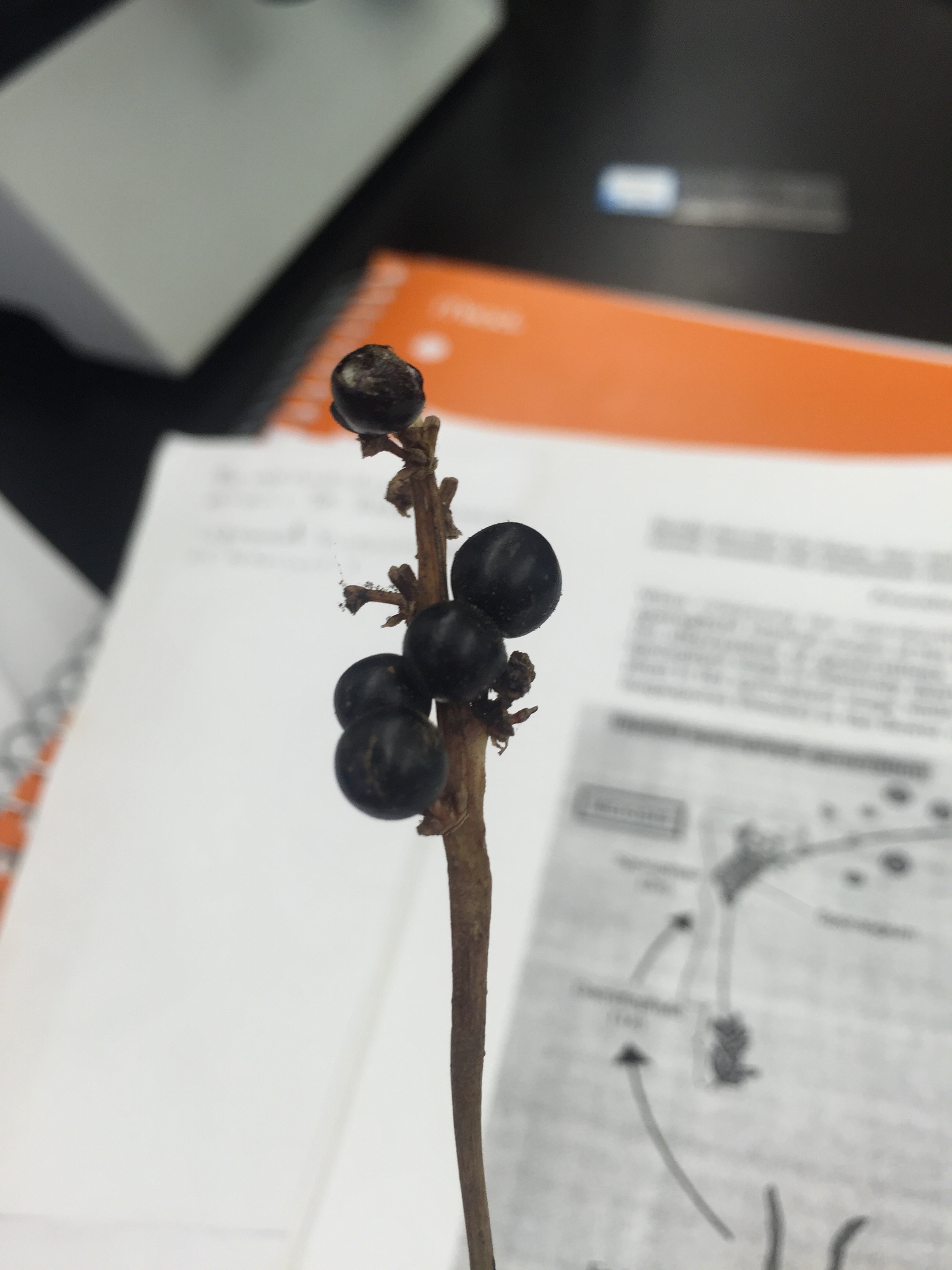 Plant Identifications and Descriptions: After thoroughly analyzing the plant samples and recording the data in the Plant Characterization Table (Table 1 below), we went to the AU library and examined a field guide consisting of plants, animals, and other organisms around Washington D.C. The first identification was of the dandelion leaf. The leaf itself is much longer than it is wide, and its has rather sharp cut pointy edges. When examining the field guide, the this leaf found in the transect matched the dandelion leaf pictured and described in the guide exactly. Next, the the fern or pine branch that was found in the transect has many similar characteristics of the Virginia pine tree that was found in the field guide. There are some rather distinct differences between the branch sample found in the transect and the picture of the pine found in the field guide, but it appears that they are most likely closely related with similar short and smooth needles as well as detailed pinecone structures attached. Prior to examining the field guide in the library, we identified that the twig like plant with several smooth spherical berries was most likely a milkweed. After examining the field guide, we determined that the features of the plant found in the transect and the picture and description in the guide were very similar in their features. Regardless of whether or not this plant is a milkweed, it seems to be very closely related. The next plant sample was a very small, light green leaf that was made up of multiple round leaves and pointy leaves. After examining the field guide, there are some similarities between the leaf sample found in our transect and the white clover leaf pictured and described in the field guide. There are several distinct features between the sample and the field guide picture in terms of leaf shape and slightly different coloring, but overall it appears that perhaps the leaf we found in the transect is part of the clover family. Lastly, we identified in lab that the brown half of a shell found in the transect best resembles a walnut. We could not find this walnut in the field guide, but after asking about it in class, we determined that it most likely is some form of a walnut. It has very elaborate details on the outside shell, and it is somewhat hollow on the inside where there most likely used to be a nut or seed inside.