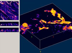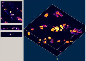 Jaewon's microscope used a 5-watt 532nm pulse laser to provide excitation. The image dimensions were 256x256 pixels, saved as unsigned 16-bit integers in separate channels. The 3-D images were reconstructed using ImageJ's Volume Viewer plugin.