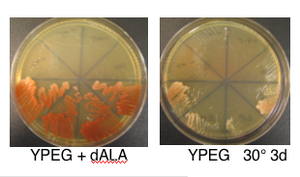 - If fusion was directed to COX3 (instead of other regions of mito genome that will eventually want to clean up) then can select for integrants as respiration defective, as well as d-ALA independent growth. True respiration defect (e.g. cox mutn) will not grow on non-fermentable carbon source even with d-ala.