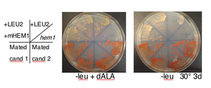 - SGD reports systematic deletion is inviable but also reports null is viable, heme and methionine auxotroph. Suggest we could select for mitochondrial expression of HEM1 in nuclear mutant by selection on -d-ALA, -heme or -met plates and measure expression levels with Western if antibody available (note: HEM1 antiserum described in very old paper [6], or epitope tagged.