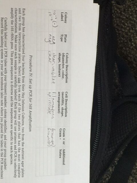 This now brings us to procedure IV which included using a PCR. “This was the setting up of the PCR for the 16s amplification.” Using the four plates you picked, two out of the four plates were picked that had the most complete characterization. The two agar plates had to be labeled and each group used primers and PCR to amplify the 16s rRNA gene. When amplifying the rRNA gene, first it started by labeling the 2 PCR tubes with the transect number, colony identifier and your group number. The labeling system was then written down in the lab notebook. 20 microliters of primer/water mixture was then added to a PCR tube that has been labeled and mixed together to dissolve the bead inside. A sterile toothpick was then used to pickup s small amount of a bacterial colony that you chose. The toothpick was then submerged in the primer/water mix PCR tube and twisted in it for 5 seconds, then discarded. The PCR tube was then sealed and placed in the PCR machine. This step was done when you used a different colony.