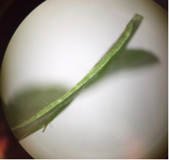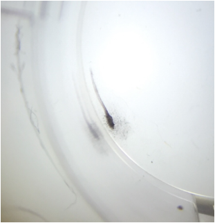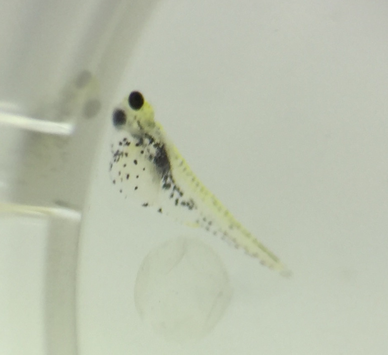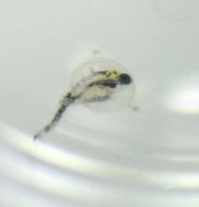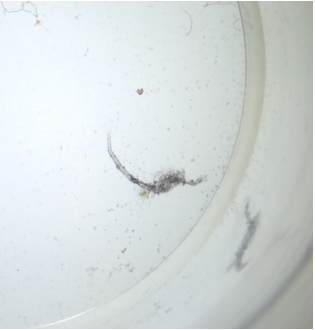 Non-caffeinated Zebrafish: Same number of alive zebrafish. They are longer and thicker than the caffinated fish. More robust, moving around more and responsive to movement of the petri dish. There is one fish growing abnormally (see image below:)