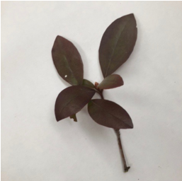 Relatively large bush, deep red/green/brown color, grew higher on the creekbank along the ferns, vascular along the backs of the leaves. Confident identification: Rhododendron carolinianum, Carolina rhododendron. Height about 5 feet.