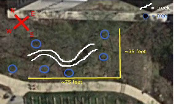 The major biotic components of the transect are trees (marked on the map with blue circles), and grasses and bushes and small shrubbery, visible in green along the entirety of the creek. There are also many forms of wildlife, such as insects and birds, as well as lichens and algae growths on the rocks forming the creek bed. Due to the time of year, there is also an ample covering of dead leaves across most areas.