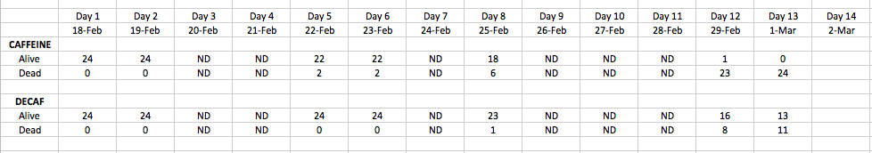 Non-caffeinated Zebrafish: alive in cells: 1,2,3,4,7,8,9,10,11,12,14,15,16,17,18,19,20,21,22,23,24.