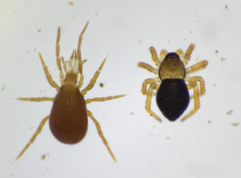 Arthropoda - Arachnids Features: 4 pairs of legs, clearly visible abdomen and cephalothorax separation, length about 1 mm, two specimen of three arachnids found in the sample.