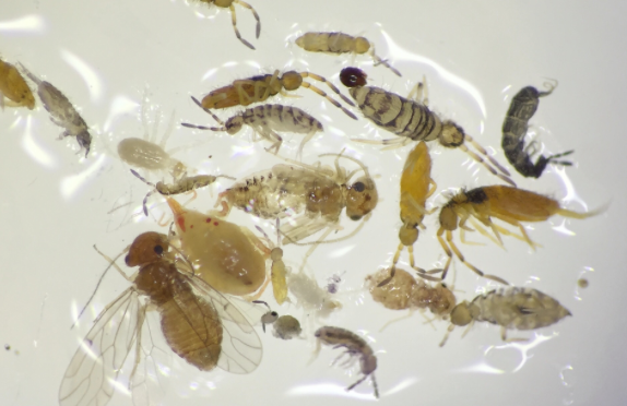 Size range of organisms found from .1mm to 2+mm. The most common organisms were Arthropoda, Insecta, which had segmented bodies and 3 pairs of legs. The smallest organisms belonged to the class Insecta but were extremely hard to identify. The largest organisms were Arachnids with the exception of one fly (Diptera).