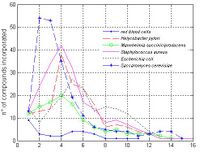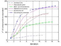 Our method has been used to characterize the usages of specific substrates in different metabolisms. At each step [math]\displaystyle{ t }[/math] of the network expansion process the method identifies the subset of metabolites [math]\displaystyle{ s(t) }[/math] that could be synthesized from the compounds available in the step [math]\displaystyle{ t-1 }[/math]. The information concering the size [math]\displaystyle{ |s(t)| }[/math] of each set [math]\displaystyle{ s(t) }[/math] could be used to derive absolute and relative profiles, describing both the total number of compounds progressively incorporated and the number of new compounds synthesized in each algorithm step [math]\displaystyle{ t }[/math]. In order to illustrate how to use our method in profiling metabolisms we simulated in each organism the process of network expansion seeding glucose as substrate, supposing that all the subsets of metabolic cofactors were initially available. The qualitative trend of the expansion process absolute profile, depicted in figure 2, is similar in all the metabolisms, with the exception of red blood cells, probably due to its little dimensions. Profiles are characterized by a rapid incorporation of compounds in the first iterations. In the terminal steps instead the size of the scope reach a saturation, since unavailable factors are required for the synthesis of novel compounds. The relative profiles, depicted in figure 3, show the relevance of each algorithm step, allowing the identification those steps in which a large number of compounds are synthesized because of the incorporation of critical compounds. The number of iterations required to reach critical compounds differs among organisms, and give an indication of the distance between the seeded compound and these metabolic hubs. The method proposed here may be used to characterize each organism in terms of “metabolic distances” among a benchmark of compounds. This requires the definition of a similarity metric between generated network expansion profiles based on the symmetric version of the Kullback-Leibler distance (Cover & Tomas 1991).