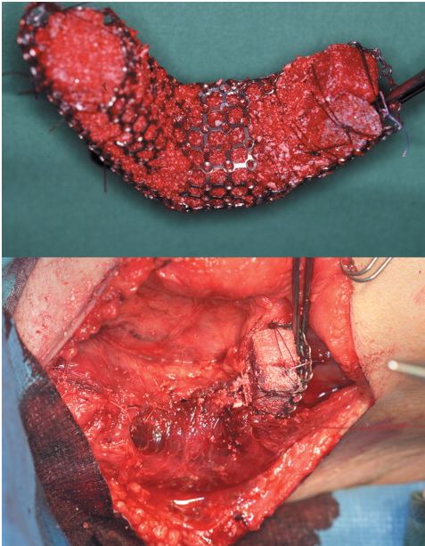 The premise of the ‘flap pre-fabrication’ method is to implant the tissue engineered construct into a highly vascularized region in vivo to favor blood vessel growth and then subsequently remove and implante it at the site of the bone defect (1). One prominent study in this field occurred when a 56-year old man who had received tumor surgery eight years earlier was seeking reconstruction of his mandible. The bone defect was greater than 7 cm and the man’s head and neck region had been severely compromised due to previous radiation treatment. To prevent the development of donor-site bone defect, the researchers decided to grow a subtotal replacement mandible inside his latissimus muscle. The goal was to use the muscle vasculature to promote angiogenesis prior to the implantation of the graft to the bone defect location. The researchers used a titanium mesh scaffold that was formed to the shape of the defect and coated with isolate BMP9, bovine collagen type I, and bone marrow to serve as an undifferentiated target for recombinant human BMP7 (see Figure 2). The scaffold was then implanted into the latissimus muscle and can be seen in Figure 3 three weeks post-implantation. The scaffold remained in the muscle for 7 weeks, at which time it was removed and relocated to the region of the bone defect. Figure 4 shows the CT scan of the patient three weeks after his final operation. The patient claims that he can happily eat sausage now and believes it is a nice addition to his previous soup and bean diet. However, this process is highly individualistic, costly, time consuming, and long-term studies have yet to be carried out causing the quest for viable vascularization options to continue (8).