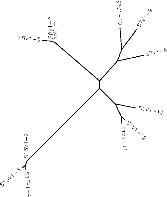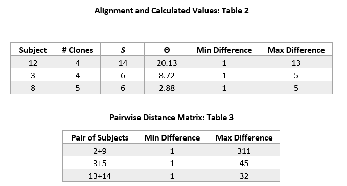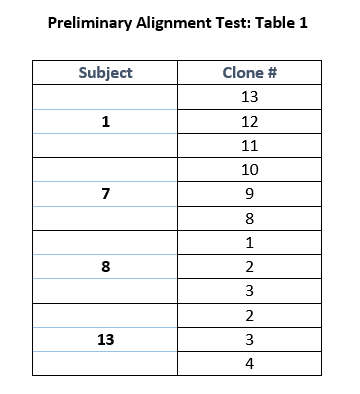 - To begin, create a multiple sequence alignment of 3 clones each for 4 subjects. Generate an unrooted tree for these values. Record which subjects and their respective clones in a table (see table 1 for reference).