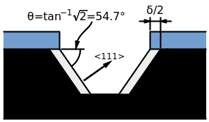 Due to silicon's single crystalline structure, some etchants are able to selectively etch silicon along certain planes or angles depending on the orientation of the silicon.[3] For example, using KOH as the etching chemical for silicon in the <100> crystal direction gives selectivity rates up to 400 times greater than using KOH to etch silicon in the <111> direction.[3] By altering time, etching chemical, and silicon crystal orientation, many different shapes and channels can be etched in the silicon wafer.[3]