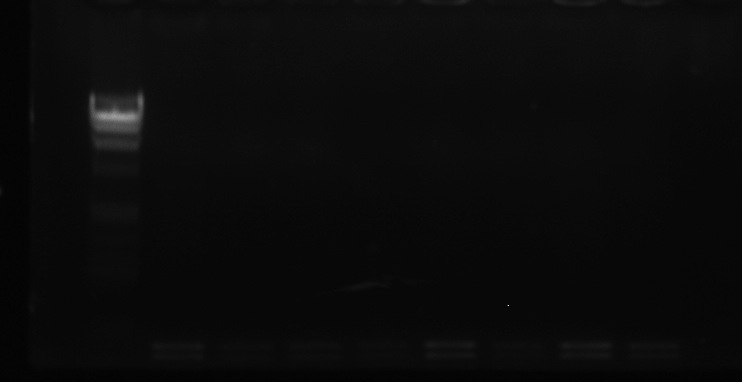 There are too many bands, so our PCR did not work. After the ladder in the first column, we have 8 of our colonies and then our control (malaria group occupies lanes 2-10). Dr. Grose said she would help us do it again, so she can see what may be going wrong. BR