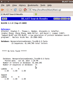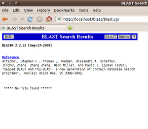 After completing this step, you should be able to run your blast from http://localhost/blast/blast.html. It is a good idea to run a positive control. Take a section of sequence from the fasta file of the database you are blasting against, and query the database with it. A positive control is a good idea because wwwblast reporting "no hits found" can be misleading - see the troublshooting section.
