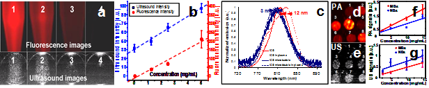 Methods and results: We have conjugated CC49 antibody with different imaging markers and tested various cancer-targeting strategies in LS174T human colorectal cancer cell cultures and xenograft mice. CC49 targets TAG-72, a human glycoprotein complex over-expressed in the extracellular space of many epithelial cancers, including colorectal, pancreatic, breast, and ovarian cancers (Fig 2a). We have radiolabelled CC49 with 124I for PET-CT imaging of the colorectal cancer xenograft (Fig 2b). We have conjugated CC49 antibody with Cy7, an Indocyanine Green (ICG) derivative, for in vivo fluorescence imaging (Fig 2c). We have also synthesized multimodal microbubbles (size: ~3um) and nanobubbles (size: ~300nm) by encapsulating various imaging agents, such as ICG, India ink, and TexasRed, in a poly-lactic-co-glycolic acid (PLGA) shell using a modified double emulsion method. TexasRed encapsulated nanobubbles have been conjugated with CC49 for cancer targeting and imaging. Fluorescence images in Figs 2f-2g show that CC49 conjugated nanobubbles effectively bind with cancer cells while nanobubble without conjugation do not bind well with cancer cells. Encapsulating multiple imaging agents in PLGA microbubbles and nanobubbles also enables quantitative multimodal imaging. As an example, we encapsulated ICG in microbubbles for simultaneous US and fluorescence imaging (Figs a and b). Although ICG is a FDA approved contrast agent, its clinical application is limited by the inconsistent spectral characteristics due to aggregation and molecular interaction in blood stream. By encapsulating ICG in PLGA microbubbles, we have demonstrated consistent fluorescence spectra in water and in plasma (Fig 3c). We have also encapsulated India ink in PLGA micro bubbles and nanobubbles for simultaneous US and photoacoustic imaging (Figs 3d-3g).