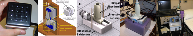 Methods and results: We propose to characterize breast lesions based on their structural and functional dynamics in response to external compressive stimuli. We have developed a handheld probe with embedded pressure sensors and optoelectronic components for noninvasive monitoring of tissue oxygen, hemoglobin concentration and their dynamic changes in response to external compression (Fig 1a). We have also tested the compression-induced tumor structural and functional dynamics on a cancer xenograft model (Fig 1b). Motivated by the preclinical results, we have further developed a handheld probe integrating US and NIR modalities for simultaneous characterization of tumor structural and functional dynamics in response to mechanical compression (Fig 1c-1d). The dynamic breast imaging technique has been tested in a 50-subject clinical trial at the OSU James Breast Health Center (IRB protocol #2005C0005). Another clinical trial has also been carried out to validate the US and NIR dual-mode probe (Fig 1e, IRB protocol #2008C0006).