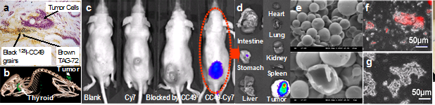 Fig 2. (a) Histological image shows extracellular expression of TAG-72. (b) PET-CT image of cancer xenograft after i.v. injection of 124I labeled CC49. (c) Fluorescence images of colorectal cancer xenograft mice at 96 hr postinjection of the following agents: Blank (PBS control), Cy7, Blocked by CC49 (excessive CC49 followed by CC49-Cy7), and CC49-Cy7. (d) Fluorescence images of dissected organs at 96 hr post-injection of CC49-Cy7. (e) Scanning electron microscopic (SEM) images of PLGA microbubbles. (f-g) Fluorescence microscopic images of colorectal cancer cells show that: (f) CC49 conjugated nanobubbles bind with cancer cells very well, (g) nanobubbles without CC49 conjugation do not bind with cancer cells.
