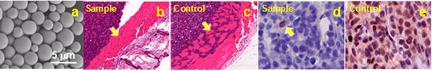 Methods and results: We propose to load combinatory epigenetic drugs in PLGA microbubbles for targeted delivery and controlled release of synergistic therapies. We also propose to conjugate anti-VEGFR2 antibody with microbubbles to target tumor vasculature and encapsulate imaging agents in microbubbles for image-guided drug delivery. To demonstrate the technical feasibility, we have successfully encapsulated 5-aza-2’-deoxycytidine (DAC, a DNA demethylation reagent), trichostatin A (TSA, a histone deacetylase inhibitor), and LY294002 (PI3Ki, a PI3K/AKT inhibitor) in PLGA micro-particulates (Fig 4a) and intratumorally injected into a sample tumor of a T-47D xenograft mouse. In comparison, the same dose of PLGA microparticulates without drugs was intratumorally injected into the control tumor of the same type. The sample and the control tumors were dissected two week post-injection for pathological analysis. According to H&E staining (Fig 4b) and Ki67 staining (Fig 4d), the sample tumor (i.e., injected with drug-loaded PLGA microparticulates) does not show cancer proliferation or invasive cancer cells beyond the tumor boundary. In comparison, the control tumor (i.e., injected with PLGA microparticulates only) shows cancer proliferation and the invasive growth of cancer cells beyond the tumor boundary (Figs 4c and 4e).