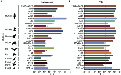 - Figure 2. Selection of Susceptible Cell Lines. 26 cell lines were infected with the pseudotyped viruses and were diluted and analyzed. The results were obtained from three independent experiments. Part A shows results for SARS-CoV-2 and B for VSV G. Although almost all cell lines were generally susceptible to infection by VSV G pseudotyped virus, SARS-CoV-2 pseudotyped virus could efficiently infect certain cell lines including three human cell lines.