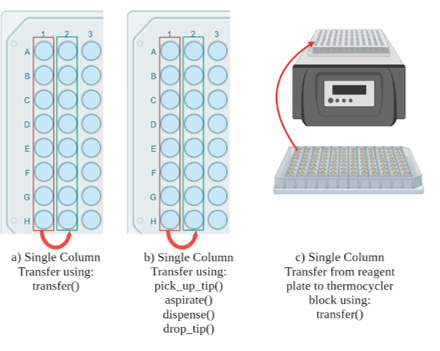 - The transfer command broken down into its individual commands for picking up tips, dropping off tips, aspirating, and dispensing to move liquid from one well to another within the same labware. (Figure 9b)