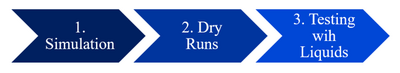 Here we describe the validation methods used, starting with simulations and dry runs, leading to final testing with coloured water reagents. The main validation metric used on the OT-2 robot was the comparison of the executed to the simulated run logs. The order of these steps is summarised in Figure 10