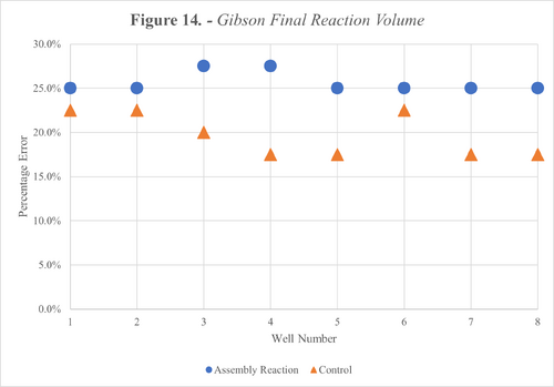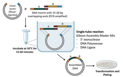 The protocol used as a reference was the NEB Gibson Assembly® Protocol (E5510)[13]. The relevant assembly steps are defined as follows: 1. Set up the following reaction on ice:
