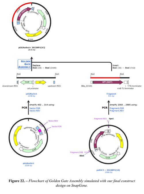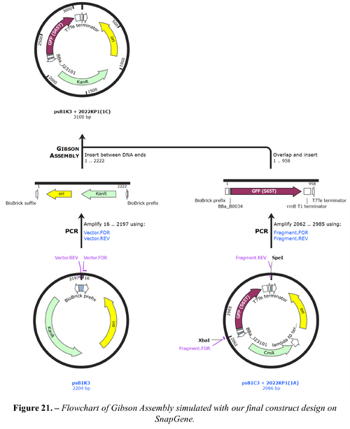 We would choose the second option as commercial synthesis is not cost-effective for our use. We also modelled and simulated each assembly using SnapGene[35], which verified the correct assembly. The full constructs designed are shown in Figures 21 and 22 below.
