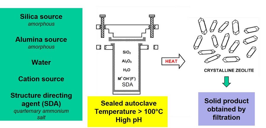 Zeolites are synthesized using batch hydrothermal synthesis at both laboratory and industrial scale. The hydrothermal synthesis takes place at high pH and the raw materials are-- a silica source, an alumina source, water, a cation source and a structure directing agent. A structure directing agent (SDA) is typically a organic quartenary ammonium salt. SDAs act as templates for zeolites and zeolites crystallize around them via hydrophobic interactions. At the laboratory scale, the raw materials (in the desired molar ratio) are fed into a Teflon lined sealed autoclave (Figure 2). The autoclave is then transferred to an oven set at a desired temperature (usually > 100°C) and left in the oven for the desired time. The solid product is then recovered from the resultant slurry, by filtration and subsequent drying. The crystalline structure of the powder zeolite can be analyzed by characterization methods like X-ray diffraction (XRD) and scanning electron microscopy (SEM), etc. Figure 3 shows the crystallization mechanism of silicalite-1. Silicalite-1 is a pure-silica zeolite with MFI framework type. Tetra-propyl ammonium hydroxide (TPAOH) is used as the SDA and tetra-ethyl orthosilicate (TEOS) is used as the silica source.2 The hydrophobic hydration spheres of TEOS and TPAOH overlap to form primary units (2-3 nm in size), which subsequently act as nuclei for the zeolite crystallization.